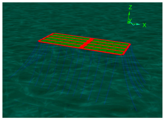 The multiple buoys, with six degrees of freedom, are connected by line units using OrcaFlex to form the buoy array of the offshore FPV, as shown in Figure 3. The hydrodynamics model of the FPV is shown in Figure 7. The red components are the multiple buoys connected, and the green ones are the solar photovoltaic panels. The offshore FPV moorings and connectors are established using line elements. The moorings are used to connect the buoys with the seabed by anchoring, which is almost completely immersed in the water, while the connectors link the buoys.