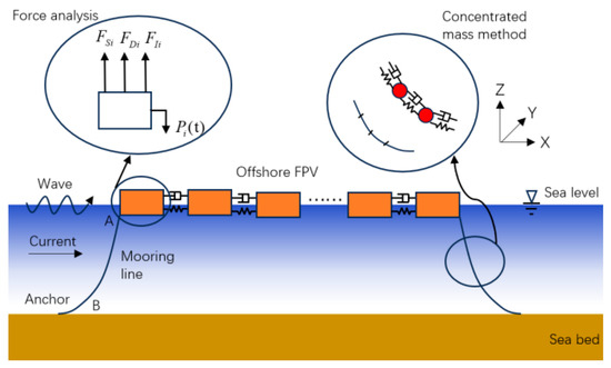 As the offshore FPV is composed of multiple floating bodies, there are a large number of moorings and connectors. The hydrodynamic response may be very complex under a combination of waves and currents, as every buoy will move in six degrees of freedom: surge, sway, heave, pitch, roll, and yaw. The adjacent buoys may interact with each other, and while the connector between the buoys is elastic, it will have both spreading and buffering effects on the load.