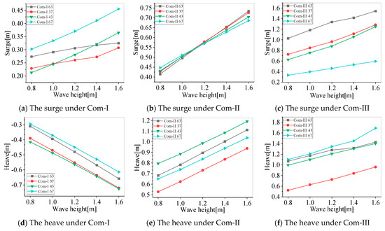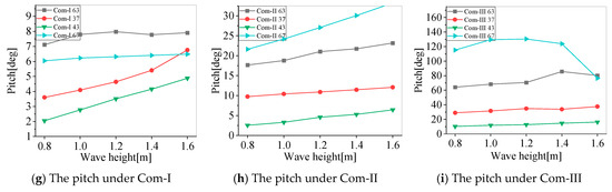 The trend curves of the connector tension with the wave height are shown in Figure 26a under Com-I, Com-II, and Com-III. The connector tension increases linearly with the wave height under Com-I and Com-II. More fluctuations and rapid increases will happen for the connector tension under Com-III due to the buoys’ severe motion resulting from the mooring’s relaxation. With the increase in the mooring static tension level, the tension of the connectors between the buoys increases as the wave height is less than 1.0 m. However, the maximum connector tension is obtained under Com-I.
