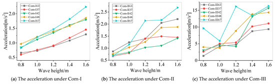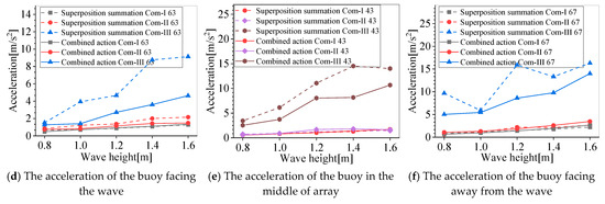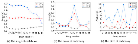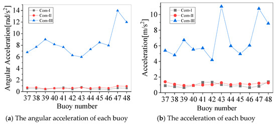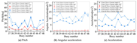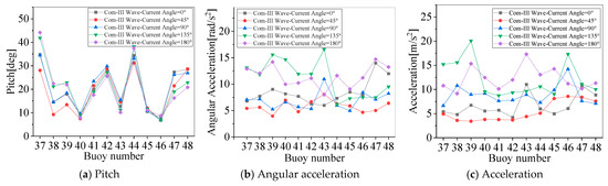 The response of the buoys in different wave–current angles in Com-III affects the mooring tension levels, as shown in Figure 22. With the increase in the wave–current angle, the current will relax the moorings facing the wave and tighten the moorings facing away from the wave. When the wave–current angle is greater than 90°, the pitch motion response of the buoys facing the wave increases and the motion response of the buoys facing away from the wave increases, as shown in Figure 22a; the pitch response of the buoy facing the wave is increased by 9.36°, and the acceleration in Figure 22b,c is also increased. The acceleration of buoy 37 facing the wave increased by 5.39 m/s2, and the acceleration of buoy 48 facing away from the wave increased by 2.45 m/s2. And the angular acceleration of the buoys is increased, e.g., the acceleration of buoy 39 is increased by 348.2%.