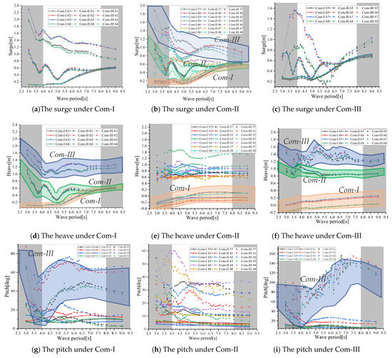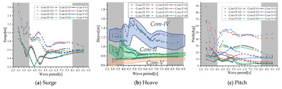 Three water depth and mooring length combinations are selected to study the FPV’s response in different tension levels, as listed in Table 5. Com-I has the largest effective mooring tension, Com-III has the smallest mooring tension, and Com-II has the middle-level mooring tension.