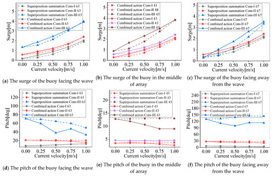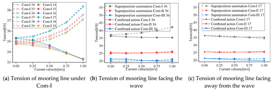 The current load only changes the position of the FPV array and increases the mooring tension. The increase in the current increases the tension of the moorings facing the current but decreases the tension of the moorings against the current, as shown in Figure 25a. It will change the binding force of the moorings on the FPV array. Therefore, the results of the mooring tension are different between the superposition and combined action, as shown in Figure 25b,c. Under the combined wave–current, the tension of the mooring facing the wave decreases with the increase in the current, but increases with the increase in the current for buoys facing away from the wave. It can be seen that under the combined wave and current, the opposite tension change trend is illustrated for the moorings facing the wave and the ones facing away from the wave. The difference between the superposition and combined action is the largest for the tension of the moorings facing the wave under Com-I, in Figure 25b.