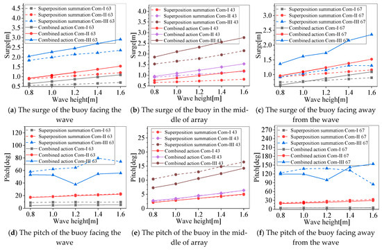 Figure 29 shows that the differences between the superposition summation and combined action are also obvious for the mooring tensions. Under Com-I, the combined action result is larger than the superposition. Meanwhile, under Com-III, the trend is the opposite, and the combined result is less than the superposition one.
