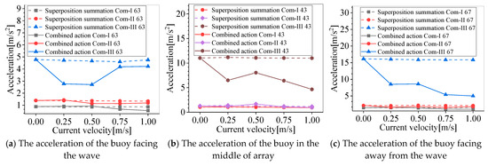 - The coupled effect of the wave–current is significant for the floating multi-buoy array. Under the combination action, the motions and accelerations of the buoys facing the actions are decreased as the moorings facing the wave and current are tightened, as the wave and current are in the same direction. Meanwhile, the motions of the buoys facing away from the wave will be violent as they are relaxed.