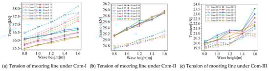 Due to the mooring lines located on different buoys in the multi-buoy FPV array, this paper may have some uncommon results compared to the single buoy platform. As shown in Figure 23, the mooring tension increases with the wave height. The maximum mooring tension happens in the array under Com-I in Figure 23a. However, the tension for the moorings facing away from the wave are larger than the ones facing the wave under Com-II in Figure 23b and Com-III in Figure 23c, due to the severe motion of the buoy facing away from the wave.