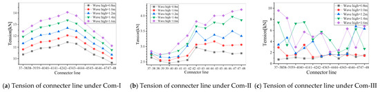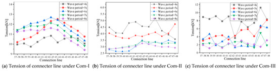 The connector tension decreases with the wave period. Under the different mooring static tensions, a similar trend of the connector tension with the wave period is shown with the tension changed with the wave height in Figure 27a–c for Com-I, Com-II, and Com-III, respectively. The maximum value happens under the wave with a small period due to the small size of the buoys. Under the wave with a large period, the tension range is smaller than the value under the small period wave.