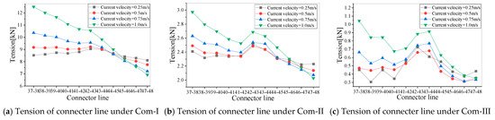 In the same direction of the wave and current, with the increase in the mooring tension level, the tension of the connectors increases, as shown in Figure 28. Figure 28a–c represent the tension changes in connectors between the longitudinal buoys under three different tension levels. When the mooring is in the most tense state, the tension of the connectors between the longitudinal buoys is quite different, and the tension of the connectors near the surface facing away from the wave, which is between buoy 47 and 48, even decreases with the increase in the current velocity, as shown in Figure 28a.