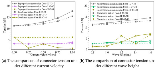 When the wave is superimposed with the steady flow, the calculation results of the wave motion value and the related load need to be corrected. The wave period is corrected from the velocity of the free flow to the performance period. The current in the same direction of the wave lengthens the wavelength and in the opposite direction shortens the wavelength [33]. The amplitude also varies at the same time [36]. Therefore, the horizontal velocity of the water points considering the wave–current interaction and not considering the wave–current interaction is different. In this paper, the effective tension of the mooring under the wave and the current on the FPV array are superimposed, and the effective tension of the mooring under the wave and current is compared. And the difference is compared under different combinations of the water depth and mooring length.