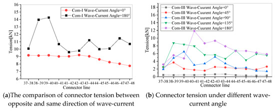Under the wave–current in the opposite direction, the wave–current angle is 180°, and the current will relax the moorings facing the wave. It will result in the sharp increase in the connection force of the buoys facing the wave, as shown in Figure 30. Under the most relaxed mooring tension level in Com-III, in Figure 30b, the relaxation increases with the increase in the wave–current angle, and the connector cannot be effectively tensed when the wave–current is in opposite direction, the constraint is weak, and the relative motion between the buoys is intense. The maximum tension of the connector under the wave is larger than that under the wave–current in same direction, by 11.4 kN.