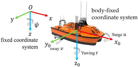 The presence of viscous forces causes relative resistance between fluid layers moving at different velocities, thereby affecting the motion of the unmanned surface vehicle (USV). The fluid viscous force acting on the USV is referenced in [29] as follows, with , …, being the viscous force coefficients: