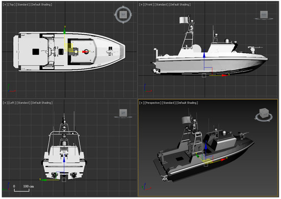 The three-dimensional (3D) geometric model of the USV digital twin serves as an accurate digital representation of its physical structure, encompassing the hull shape, internal framework, and key components such as thrusters, rudders, and sensors. This model must precisely reflect the USV’s dimensions, mass distribution, and inertial properties while being compatible with computational fluid dynamics (CFD) and structural simulation tools to facilitate environmental interaction modeling, motion behavior analysis, and dynamic response simulations. As shown in Figure 4, this study utilizes 3Ds Max (https://www.autodesk.com/products/3ds-max/overview, accessed on 28 April 2025) to construct and assemble 3D models of various USV components, forming a complete and detailed USV model. The created model is then exported in .fbx format and imported into the UE4-based digital twin platform. This ensures that the virtual USV model is fully consistent with its physical counterpart, allowing for accurate simulation of hydrodynamic forces and motion behavior in a virtual environment.