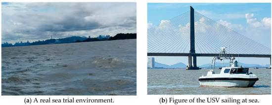 To obtain the observational data sequences required for parameter identification of the twin USV, full-scale sea trials were conducted in a designated maritime area in Zhuhai. The experimental environment is shown in Figure 8a, while Figure 8b illustrates the USV during its navigation process. The USV is equipped with a GPS sensor and an Inertial Measurement Unit (IMU), enabling real-time acquisition of position, velocity, and attitude data. The unmanned surface vehicle (USV) is equipped with a high-precision GPS sensor and an Inertial Measurement Unit (IMU). The GPS sensor has an accuracy range of 2–5 m, which can improve to 1 m under optimal signal conditions. It supports an update frequency of up to 20 Hz to meet high-precision requirements, enhancing the stability and reliability of positioning. The IMU includes an accelerometer, gyroscope, and magnetometer, capable of measuring three-axis acceleration and angular velocity, providing accurate attitude and motion data. The accelerometer has an accuracy of 0.01 g, and the gyroscope accuracy can reach 0.01°/s. The drift issue is effectively reduced through sensor fusion algorithms, which combine GPS data to improve attitude estimation accuracy and ensure stable attitude and motion information, even when GPS signals are weak or lost.