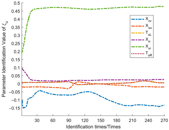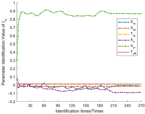 The parameter identification process for the twin USV model in this experiment is illustrated in Figure 13, Figure 14 and Figure 15. Specifically, Figure 13 presents the identification process for longitudinal dynamics parameters, Figure 14 depicts the identification of lateral dynamics parameters, and Figure 15 showcases the identification of yaw dynamics parameters.