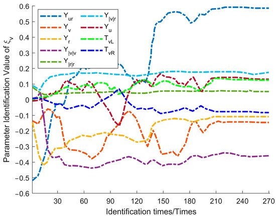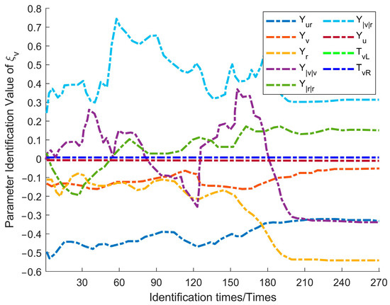 During the parameter identification process, the dynamic sliding window-Unscented Kalman Filter (DSW-UKF) algorithm demonstrated both rapid convergence and stable performance. In the identification of longitudinal dynamics parameters, all parameters reached a stable convergence attitude after approximately 90 iterations. Parameters , , and exhibited minor fluctuations in the early stages but quickly stabilized, while demonstrated a particularly strong convergence effect. Meanwhile, propulsion-related parameters ( and ) remained constant, indicating high resistance to wind and wave disturbances. Lateral dynamics parameters play a crucial role in the USV’s lateral motion, which is significantly affected by environmental disturbances such as wind and waves. As a result, and showed large initial variations but gradually converged after multiple iterations, reflecting the adaptability of the algorithm. For yaw dynamics parameters, the overall identification process remained stable. The nonlinear parameter achieved high accuracy, while the linear parameter exhibited minor initial fluctuations before eventually stabilizing.