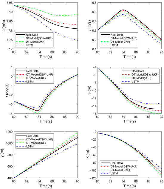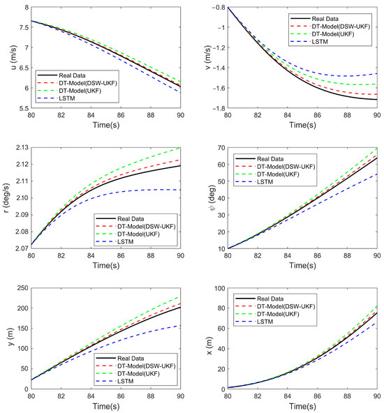 In a dynamic marine environment, factors such as wind and waves fluctuate over time, making long-term prediction accuracy difficult to guarantee. To mitigate the impact of environmental uncertainties, a 10 s prediction window was selected as a reasonable timeframe. The 10 s prediction results for the 20° right turn maneuver under wind and wave conditions are shown in Figure 12. The performance of different prediction methods varies across the results. Among them, the DT-Model (DSW-UKF)—the twin model iteratively optimized using the DSW-UKF algorithm—demonstrates the best performance across all prediction parameters. It accurately reflects the USV’s motion attitude and exhibits superior real-time adaptability and precision, particularly in handling time-varying dynamics and uncertainties.