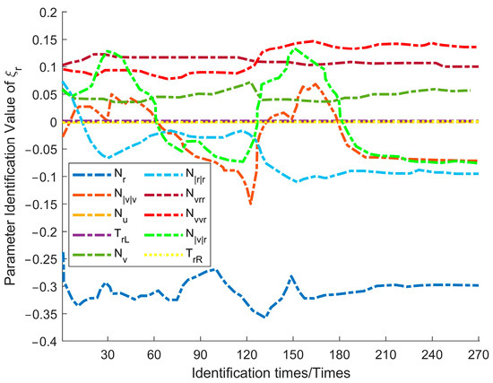 Identified parameter values at the 210th iteration for the 20°/−20° Z-type maneuver test under wind and wave conditions.