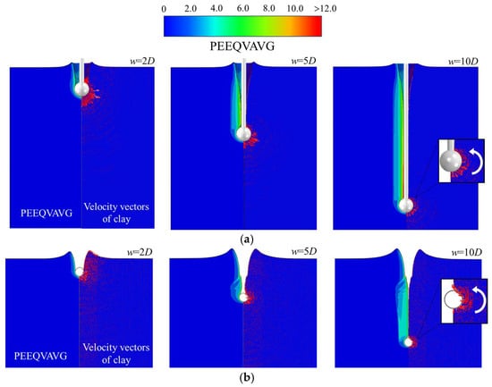 To validate the accuracy of the model, a comparison was conducted with the results of Tho et al. [37]. Figure 6a presents the soil deformation patterns obtained by Tho et al. [37] using the CEL method at different penetration depths for the T-bar. Correspondingly, Figure 6b shows the equivalent plastic strain contours from this study under the same material parameters. In the Eulerian framework, the equivalent plastic strain (PEEQVAVG) is calculated as a weighted average of the volume fractions of all materials within the element. This approach more accurately captures the overall plastic accumulation during material flow and quantifies the extent of the deformation. The results of this study closely align with those of Tho et al. [37], with regions of high equivalent plastic strain primarily concentrated along the path traversed by the T-bar during penetration.