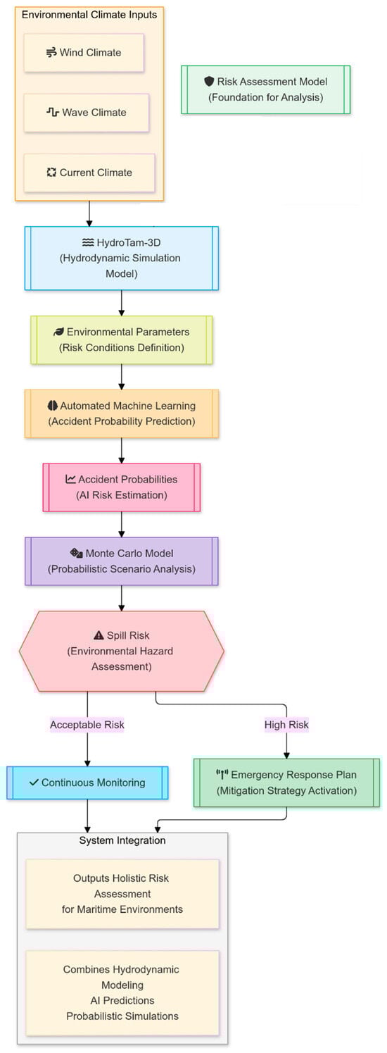 In this paper, the Hybrid Maritime Risk Assessment Model (HMRA) Integrating Automated Machine Learning (AML) and Deep Learning (DL) with Hydrodynamic and Monte Carlo Simulations (MCS) was developed to meet these research gaps in the literature. The Undersecretariat of the Maritime Affairs Search and Rescue Department accident documents were analyzed to identify marine accident risks. The flow chart of the HMRA model is given in Figure 1, which explains the procedure for estimating accident probabilities, potential risks, and the average volume of spills in an accident.