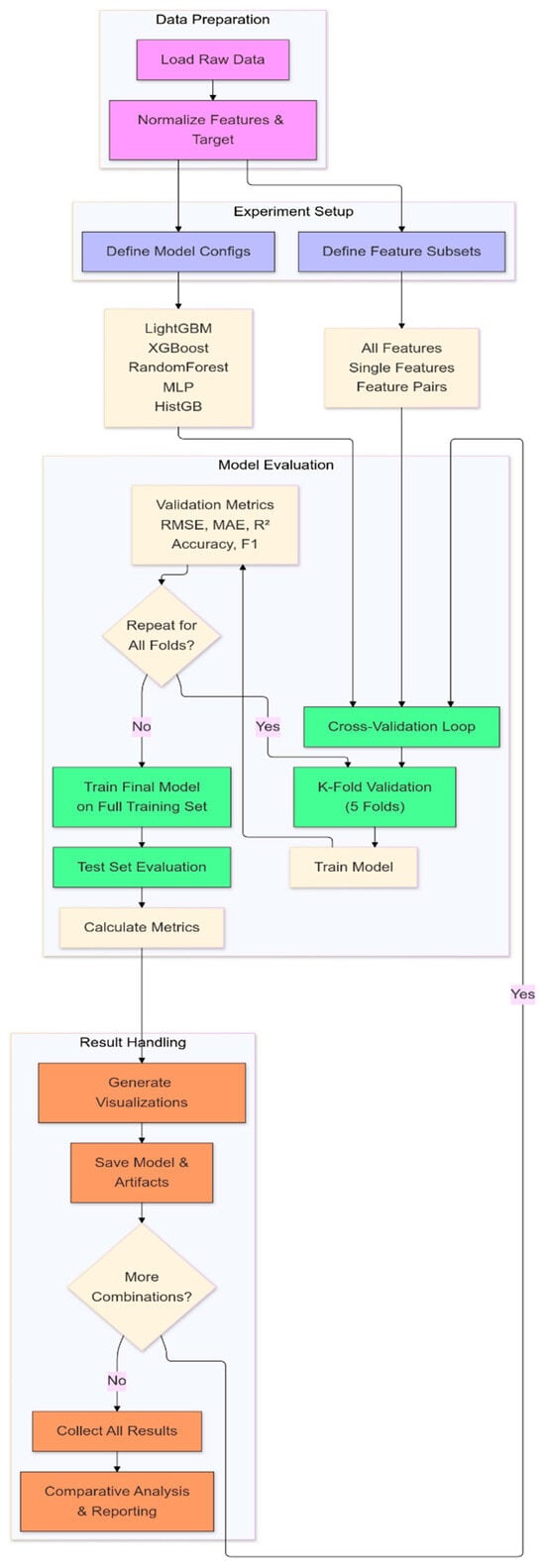 Six AML algorithms, LightGBM, XGBoost, Random Forest, Multilayer Perceptron (MLP), and Histogram-Based Gradient Boosting (HGB), are deployed using cross-validation, with the model architectures calibrated based on a dual strategy of baseline configurations and hyperparameter optimization. Figure 2 summarizes this integrative model structure by explaining its operational workflow that addresses continuous probability estimation and discrete risk categorization.