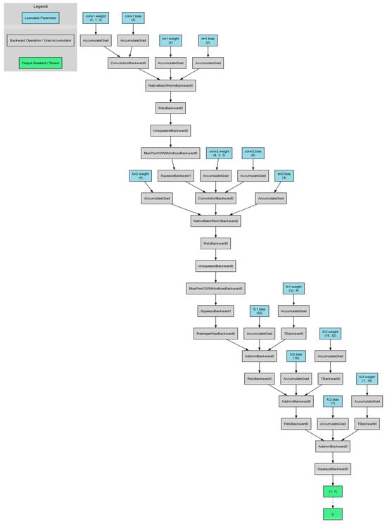 The Convolutional Neural Network (CNN) Deep Learning Model is implemented in PyTorch version v2.0.0+cpu for deep learning prediction and classification []. The model architecture is shown in Figure 4, in which normalization layers, activation functions, combining operations, and associated layers work together to learn input data characteristics. The model starts with a convolutional layer [,,], employing four filters for the input data. A batch normalization layer follows, using activation functions to improve convergence. After convolution and normalization, the rectified linear unit (ReLU) activation function is employed to learn non-linear data patterns. Then, an additional convolutional layer with eight filters is used to refine learning, followed by a second batch normalization layer for stable learning. The predictions are produced from these connected layers with the bias terms. The activation function at the output scales the predictions, and the gradients for each weight and bias parameter are accumulated. The weights are adjusted iteratively to improve training stability and convergence. The CNN model is designed with a multi-layer extraction approach by combining convolutional layers, batch normalization, and pooling operations as deep learning.