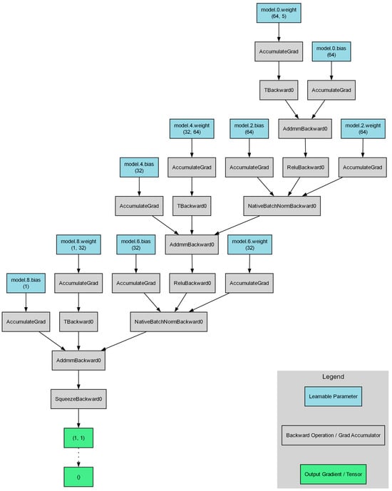 The PyTorch implementation of Multi-Layer Perceptron Deep Learning (MLP-DL) is connected to smart maritime safety []. The model consists of five input layers, which connect to several dense layers with weight and bias parameters, batch normalization applied, activation functions, and optimization layers, as represented in Figure 5. This layer is the input layer that consists of 128 neurons, to which a linear transformation is applied to the input data that are passed through a batch normalization layer. Hence, the rectified linear unit (ReLU) activation serves multiple purposes, such as capturing non-linearity and enhancing learning ability.