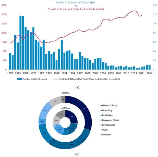 (a) The distribution of oil spills greater than seven tons from 1970 to 2024; (b) their causes categorized by spill size [,].