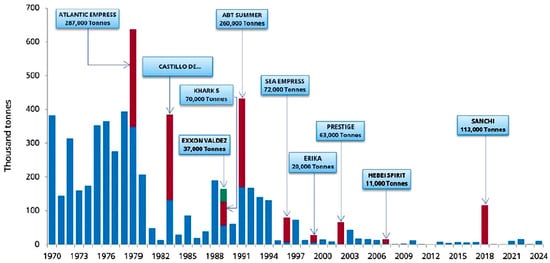- ITOPF Tanker Owners Pollution Federation. Oil Tanker Spill Statistics; ITOPF Tanker Owners Pollution Federation: London, UK, 2025; Available online: https://www.itopf.org/knowledge-resources/data-statistics/ (accessed on 4 February 2024).