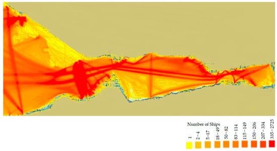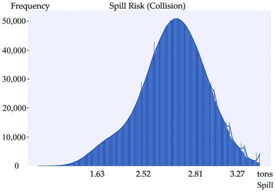 The risk involved generating 30,000 maneuver simulations within the MSC model and incorporating probability distributions modeled within the model. The HYDROTAM-3D model was interrelated with MSC to simulate wind, wave, current, and weather conditions [,,] and was interrelated with accidents modeled by probability distributions derived from the data.