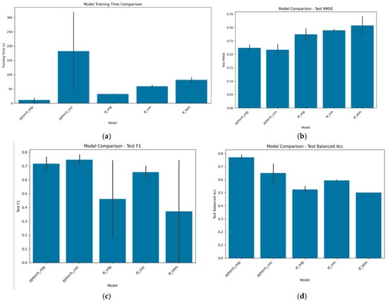 The RMSE, MAE, and R2 regression metrics measure the model’s ability to determine the accuracy of predictions. RMSE penalizes deviations proportionally, and MAE specifies scale-invariant error analysis. The R2 coefficient guarantees predictive reliability by measuring variance explained relative to the mean. These metrics reinforce the model’s calibration with the continuous nature of accident probabilities necessary for risk prioritizing. The classification metrics of the F1-score, balanced accuracy, and logarithmic loss estimate the model’s effectiveness by reflecting the equilibrium between type I and II errors. The dual approach evaluates how well probabilistic predictions stratify cases into risk categories []. Balanced accuracy accounts for potential class unevenness by averaging recall across these categories []. Logarithmic loss enforces a penalty derived from the Kullback–Leibler divergence [], penalizing the wrong classifications and thus verifying uncertainty estimation within the classification patterns [,].