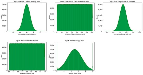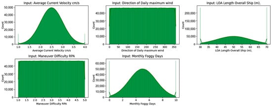The dataset captures key maneuverability parameters, such as maneuver difficulty, which has a mean value of 0.45, suggesting that most cases involved moderate difficulty in navigation based on the Guide Specifications and Commentary Vessel Collision Design of Highway Bridges []. Considering the environmental conditions, site characteristics were incorporated using the wind, wave, and current sub-models. The severity of the accident, rated on a scale of 1 to 5, has a mean of 1.7, indicating that most incidents were considered to be of moderate severity [,].