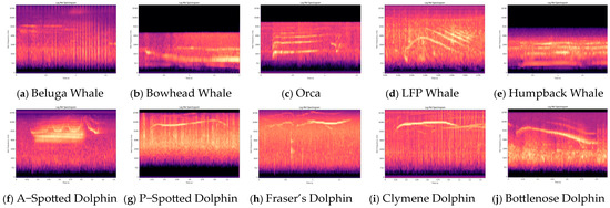 Log−Mel spectrograms of (a–e) five whale species, including the LFP whale (long−finned pilot whale), and (f–j) five dolphin species, including the A−Spotted Dolphin (Atlantic spotted dolphin) and P−Spotted Dolphin (Pantropical spotted dolphin).