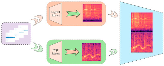 Figure 4 presents the Log-Mel spectrograms of vocalizations from ten marine mammal species in the Watkins dataset, comprising five whale species and five dolphin species. The Log-Mel spectrogram offers detailed visualization across time and frequency, highlighting distinct differences in vocalization patterns between whales and dolphins. Specifically, the average vocalization frequency of whales ranges from 500 Hz to 2000 Hz, with species such as orcas and long-finned pilot whales reaching up to approximately 8000 Hz. In contrast, dolphin vocalizations span a higher frequency range, from 4000 Hz to 16,000 Hz, significantly exceeding that of whales. At a macroscopic level, these differences in frequency distribution provide a basis for broad classification. However, distinguishing between specific whale and dolphin species requires us to capture finer interspecies variations, which presents a challenge for traditional classification methods and necessitates the extraction of more discriminative features. To address this, we employ a feature fusion strategy that combines MFCCs and Log-Mel spectrograms—both commonly used in marine mammal sound classification—with Constant-Q Transform (CQT) features, which provide superior resolution in the high-frequency domain. Our feature fusion approach is inspired by the study of Du [36] et al. Unlike the method of Yu [34] et al., which performs cross-fusion of spectrogram features, we concatenate different spectrograms along separate channels. This approach preserves the internal integrity of each spectrogram while achieving spectrogram feature fusion. The specific process of feature fusion is illustrated in Figure 5 and Figure 6.