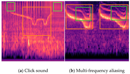 (a) The orange box highlights the main signal, while the green box indicates the click sound. (b) The orange box highlights the main signal, while the green box represents multi-frequency aliasing.