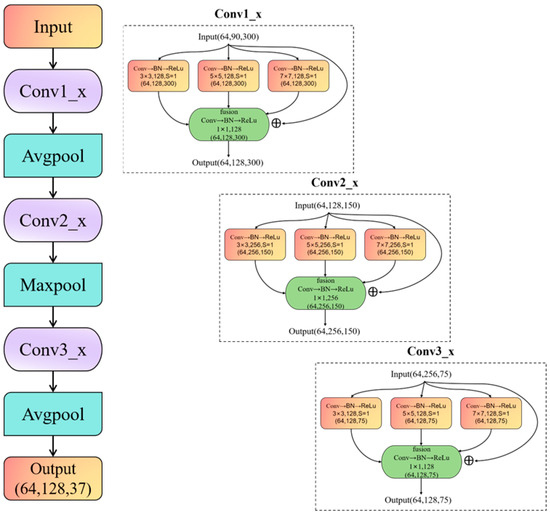 To tackle the aforementioned challenges, we introduce a multi-scale parallel convolution approach to efficiently capture a variety of features from the spectrogram. As shown in Figure 10, the network utilizes residual blocks and incorporates a multi-scale parallel feature extraction framework. The architecture consists of four branches: three branches utilize convolutional kernels of different sizes (3 × 3, 5 × 5, and 7 × 7) to extract features at multiple scales, while the fourth branch incorporates a residual skip connection that directly passes the unprocessed input to the next layer. After feature extraction, the outputs from all four branches undergo channel fusion, followed by a 1 × 1 convolution to compress the channels. The use of multiple kernel sizes ensures the extraction of multi-scale discriminative features, while the residual skip connection mitigates gradient vanishing and gradient explosion issues, facilitating stable training. Additionally, the channel compression after fusion prevents excessive growth of feature channels, optimizing computational resources.