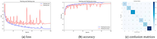 After establishing the multi-scale dual-channel network model, we set the training parameters as shown in Table 5. The model is optimized with cross-entropy loss, Adam, and the ReLU activation function. Based on comparative experiments evaluating training accuracy, data utilization efficiency, and training time, a batch size of 64 was selected. The number of training epochs was set to 100, and the trained models were retained. Finally, the model was evaluated on the test set, and the best-performing results were recorded.