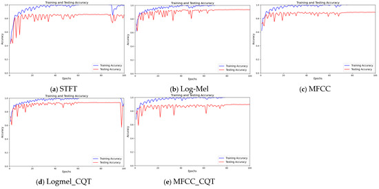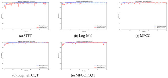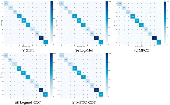 Recognition accuracy of the ChangLong dataset based on ResNet-18 using different feature extraction methods: (a) STFT, (b) Log-Mel, (c) MFCC, (d) Logmel_CQT, and (e) MFCC_CQT.