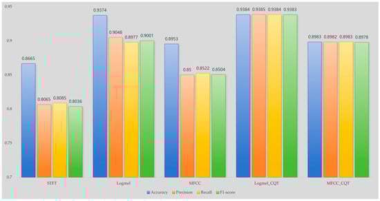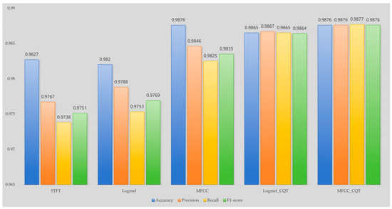 As illustrated in Figure 20, the fused feature Logmel_CQT demonstrates superior performance compared to Log-Mel, with improvements of 0.1% in accuracy, 3.37% in precision, 4.07% in recall, and 3.82% in F1-score, respectively. Similarly, the fused feature MFCC_CQT outperforms MFCC, achieving improvements of 0.3% in accuracy, 4.82% in precision, 4.61% in recall, and 4.74% in F1-score. These results indicate that the proposed fusion features effectively capture the underlying characteristics of the data, thereby improving the model’s classification performance. Furthermore, in the ChangLong dataset, Logmel_CQT exhibits an overall superior performance compared to MFCC_CQT.