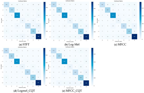 As shown in Figure 21, among the STFT, Log-Mel, and MFCC features, Log-Mel performs the best, followed by MFCC, while STFT shows the weakest performance. However, Log-Mel struggles with classification in categories 4 and 6; however, for the remaining categories, despite some misclassifications, its performance is relatively better. MFCC slightly outperforms Log-Mel in category 3, but in all other categories, it falls short compared to Log-Mel. Notably, the fused feature Logmel_CQT significantly improves classification performance in category 6 compared to Log-Mel alone. Overall, the fusion features demonstrate a well-balanced performance across all categories, enhancing both the accuracy and stability of the classification model.