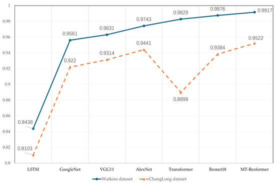 By comparing our research with studies from other scholars in the same field, we gained insights into the performance level of our proposed model in marine mammal call classification for species identification. To further evaluate the model’s adaptability to fine-grained marine mammal call classification tasks, we conducted experiments on the Watkins and ChangLong datasets. We compared our MT-Resformer model against several benchmark models, as shown in Figure 22, including LSTM [50], GoogleNet [51], VGG11 [52], AlexNet [53], Transformer [38], and ResNet18 [46].