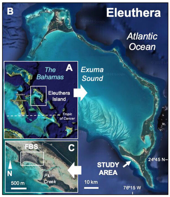 - Savarese, M.; Curran, H.A. Origin of Late Holocene strandplains in the southern Exuma Islands, Bahamas: Progradation, ephemeral highstands, and storminess. In Proceedings of the 16″ Symposium on the Geology of the Bahamas and Other Carbonate Regions; Glumac, B., Savarese, M., Eds.; Gerace Research Centre: San Salvador, Bahamas, 2016; pp. 39–59. [Google Scholar]