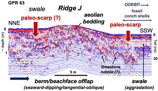 - Grasmueck, M.; Weger, R. 3D GPR reveals complex internal structure of Pleistocene oolitic sandbar. Lead. Edge 2002, 21, 634–639. [Google Scholar] [CrossRef]