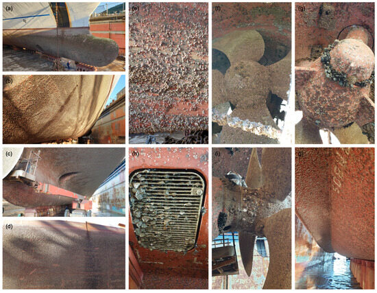 Images of the underwater hull, propeller, and thruster before cleaning at the drydock (all parts are covered with marine life): (a) bulbous bow, (b–d) underwater hull, (e) enlarged photograph of underwater hull, (f) thruster propeller seen from the front, (g) thruster propeller seen from the back, (h) sea chest grating, (i) propeller, and (j) lower hull of the bilge keel.