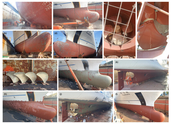 Images of the underwater hull, propeller, and thruster during and after cleaning at the drydock: (a,b) jet cleaning of the underwater hull, (c,d) sand blasting of the underwater hull, (e) cleaning of the thruster, (f) painting of the thruster, (g) disassembled propeller after cleaning, (h–j) touch-up painting with anti-corrosive paint, and (k,l) full painting with antifouling paint.