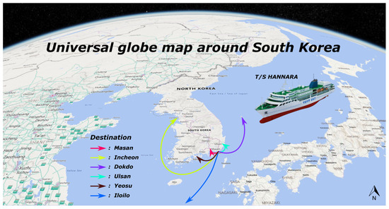 Figure 3 shows a universal globe map of the routes sailed by T/S HANNARA. The starting point for all the routes was Busan, where it was moored at the university wharf. Starting from Busan, the ship sailed to Ulsan and Dokdo to the east, Masan, Yeosu, and Incheon to the west, and Iloilo abroad. The training ship performed voyages in various seasons and sea environments. Therefore, a fuel consumption prediction model could be created based on data collected in various environments.