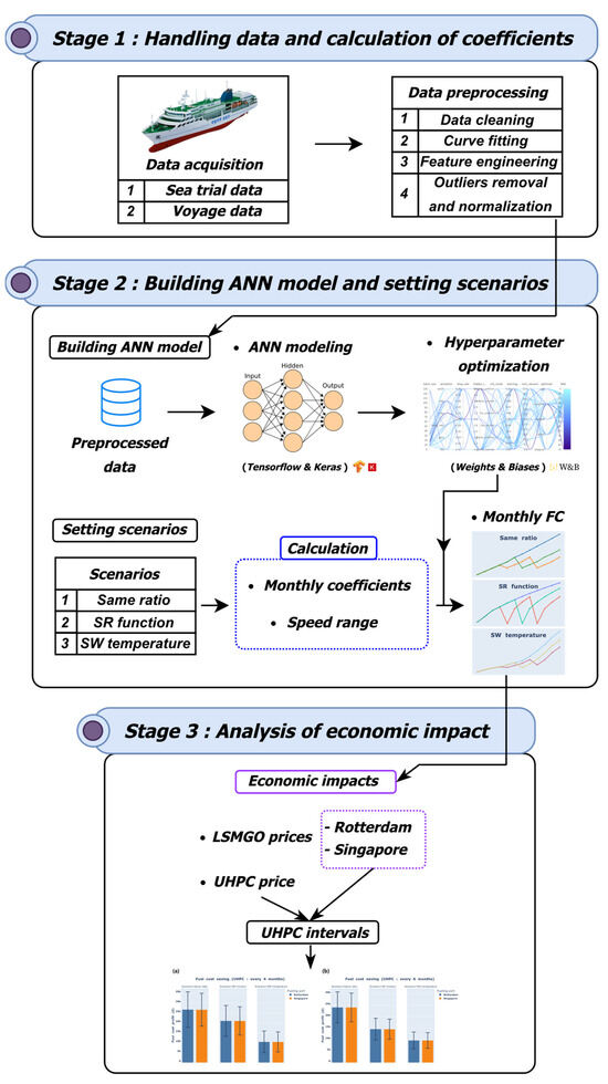ANN modeling was implemented using the TensorFlow and Keras libraries. The ANN model was trained using NVIDIA GeForce RTX 3090 hardware and CUDA 11.2 software. The number of epochs of the ANN was set to 300, and early stopping was set to 10 to prevent overfitting. The variables ‘speed log’, ‘shaft power’, and ‘power difference’ were used as input variables, ‘FC’ was used as an output variable, the outliers were removed, and min–max scaling was carried out for normalization.