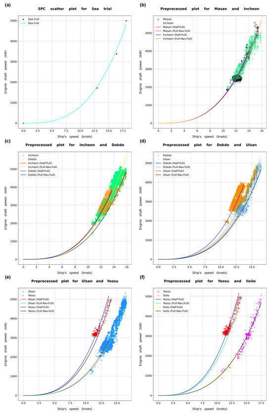 The data used for curve fitting of the sea trial were the progressive speed trial data. A value of 0 was added to the ship speed and shaft power to draw a fitted SPC. As the sea trial data were not significantly large, the was calculated for the entire speed range. Consequently, as listed in Table 6, the in Equation (7) was obtained as 0.8139 for the sea trial.