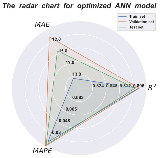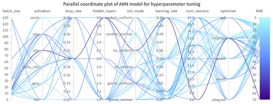 Various hyperparameters exist in the ANN model, and their performance can be improved through appropriate combinations of the hyperparameters. Therefore, the hyperparameters were selected, as shown in Table 7, and hyperparameter optimization was performed using the W&B library. The library can be referenced for hyperparameter descriptions [37]. The Bayesian search method was used in the W&B’s hyperparameter optimization process to minimize the of the validation set, and the number of trials was set to 100 [38,39]. It took 5.5 h to train the ANN model and optimize the hyperparameters. The W&B library has the advantage of visually presenting a parallel coordinate plot to help users understand which hyperparameter combination produces the optimal performance. Thus, users can save time by eliminating, in advance, hyperparameter combinations that do not produce a good performance.