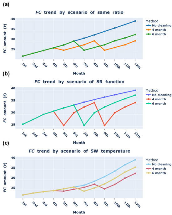 Referring to Table 6, no UHPC was performed on the ship for approximately a year from 31 October 2022 to 16 October 2023. Therefore, a scenario analysis was conducted based on the values of the Ulsan and Yeosu voyages. Three scenarios regarding the change for a year were made, as follows: (1) the would increase at the same rate every month, (2) the would increase along the SR function graph, and (3) a weight may be given according to the SW temperature for the . Scenario (1) offers a simple and fast calculation method, owing to the same value of the monthly increasing . Scenario (2) is based on two research results. According to Visscher, the sum of the ratios for light, moderate, and heavy fouling showed the SR function graph form over the period after the last previous drydocking [40]. Furthermore, the coating efficiency gradually decreased with the form of the SR function graph, as per Hadžić et al. [41]. Hakim et al. showed that growth of roughness and fouling followed the form of an SR function graph over time [6]. Munk et al. also showed that hull roughness assumed the form of an SR function graph over time [42]. Therefore, referring to the pattern of increase in fouling and decrease in the coating efficiency, this study also inferred that the increased in the form of an SR function graph. According to Graham and Gay, Lord et al., and the UK Defence Club, a warm SW temperature is related to an increase in marine fouling species and attachment [43,44,45]. According to Crisp, 20% to 100% of the barnacles Balanus balanoides and Elminius modestus were found to die in severe winter [46]. Therefore, a weight based on the SW temperature was assigned to the change in the under Scenario (3).
