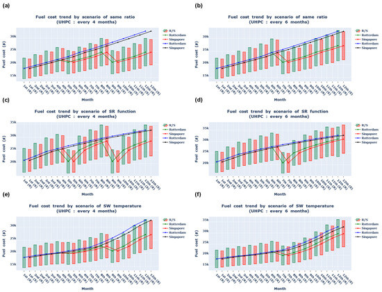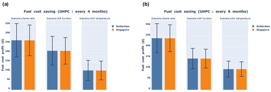 The fuel costs for four- and six-month UHPC intervals were calculated using monthly fuel consumption and low-sulfur marine gas oil prices from two international ports. The annual fuel cost savings were calculated from the one-year fuel costs incurred with and without UHPC being performed, and these were presented as candle and line charts; for comparison, the cost when UHPC was not implemented was shown as a line chart. The results confirmed that the monthly fuel costs decreased for either of the UHPC intervals. Particularly, for the four-month cycle, the fuel cost saving was found to be greater. Yearly fuel cost savings of USD 10,402–26,685 and USD 9653–24,102 were achieved with four- and six-month UHPC cycles, respectively. Ship management companies can determine the optimal hull cleaning timing by considering various UHPC intervals and hull cleaning costs.