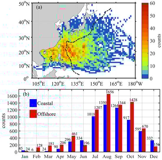- Jin, M.; Zhao, Z.; Wu, R.; Zhu, P. Latitudinal and Seasonal Variations in Tropical Cyclone-Induced Ocean Surface Cooling in the Tropical Western North Pacific. J. Meteorol. Res. 2023, 37, 790–801. [Google Scholar] [CrossRef]